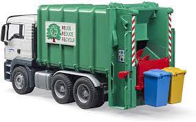 This MAN TGS Rear Loading Garbage truck is ready for trash pick up day! The Process: Empty small refuse bins or containers into the back of the truck, the spindles turn the refuse into the container, and when the container is ready to be emptied, the opening rear flap that can be locked into position and the container can be tipped to empty out the load. Two refuse bins included. A great addition to this truck is item no. 02607 featuring three small and one large bin.