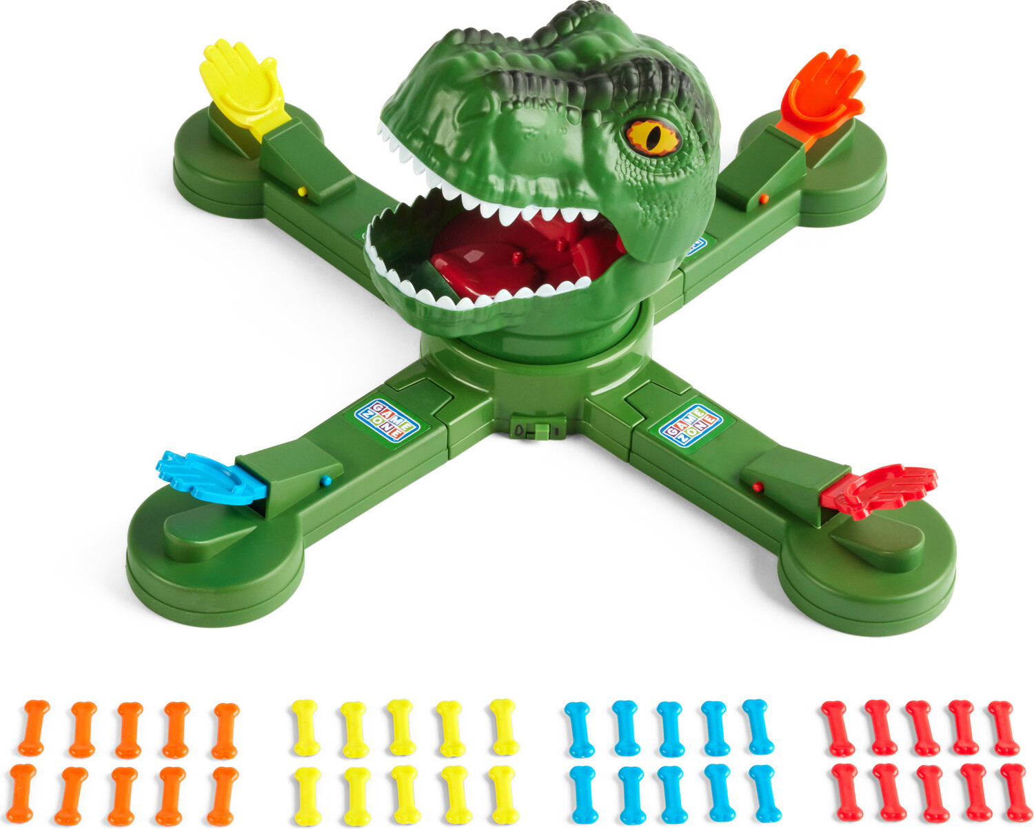 - HOW TO PLAY: Each player has 10 colored bones to match up to your launcher. Try to launch your bones into his mouth as he spins around with his jaws opening & closing. First person to get all their bones in wins!!!
